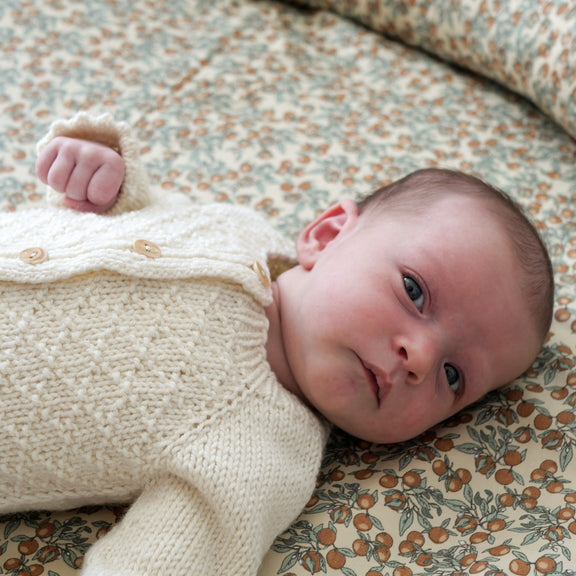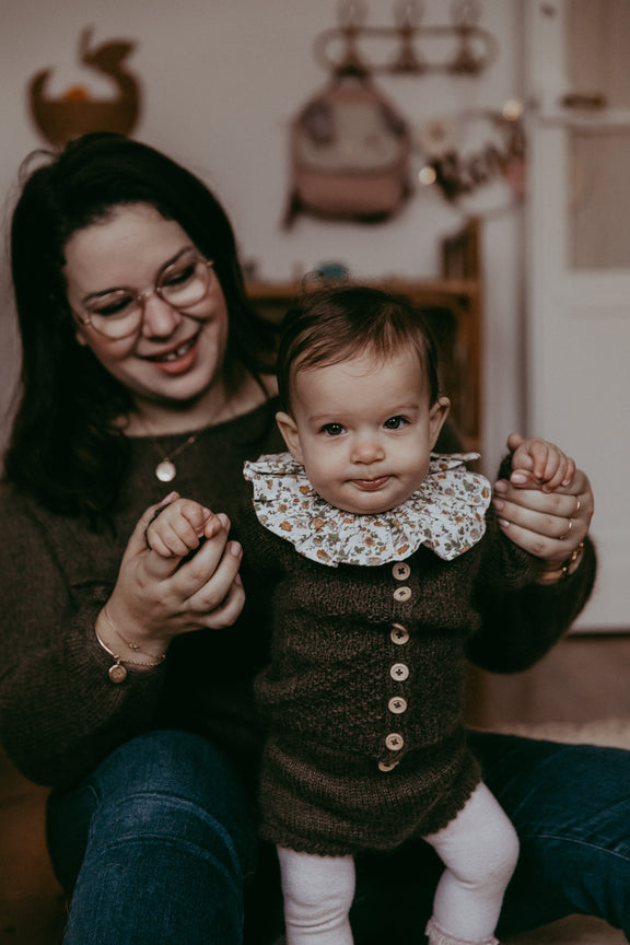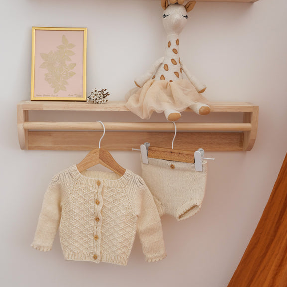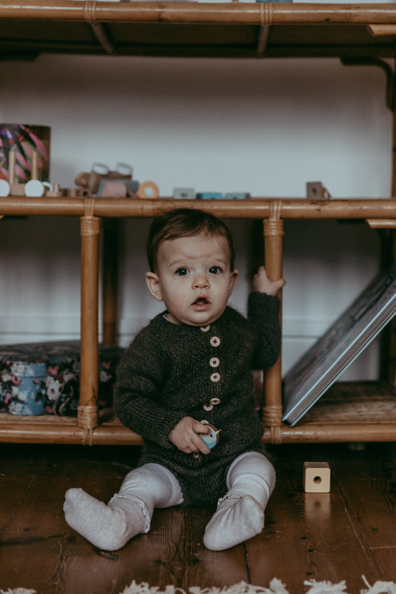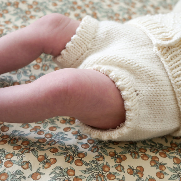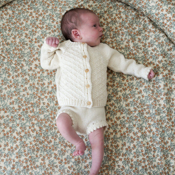 The (mini) Gaufrette set is a baby set knitted in DK, consisting of a bloomer and a cardigan with raglan armholes.