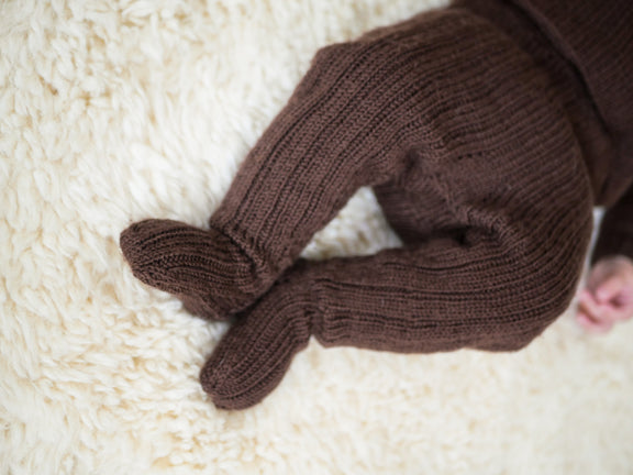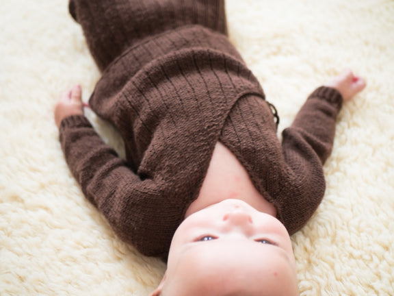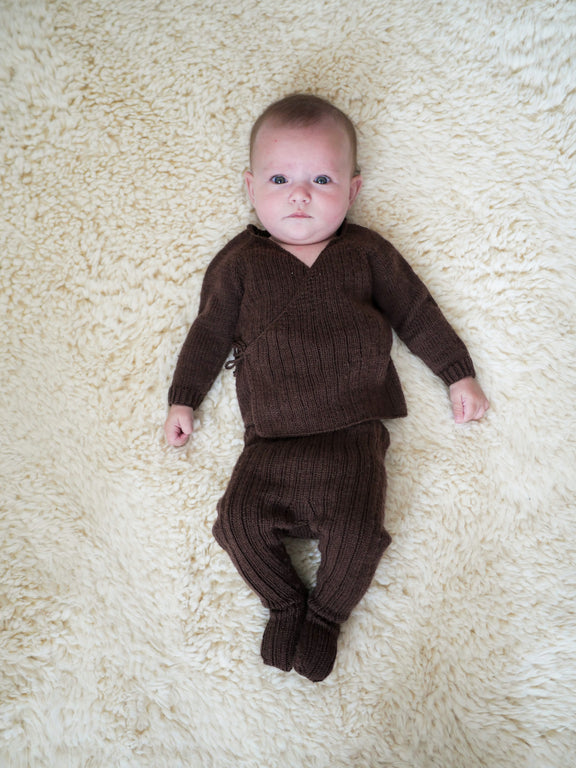 It includes the 2 essential pieces of a birth set: tights with or without feet, as well as a wrap-over. Both pieces are knitted in the round, in 3/1 rib and are perfectly mixed.