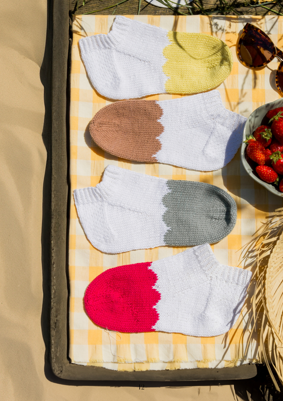 Les Socquettes Gelato sont de jolies socquettes avec un jacquard en feston au bout du pied. Tricotées dans notre base n°4 - Coton cachemire, elles seront parfaites pour la saison estivale. Les finitions sont soignées (côtes torses, talon en point “œil de perdrix”) et rendent ces chaussettes élégantes à porter.