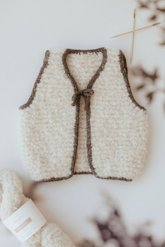 Le gilet (mini) Bavarois est un gilet de berger tricoté en point mousse et doté de jolies finitions en icord qui lui