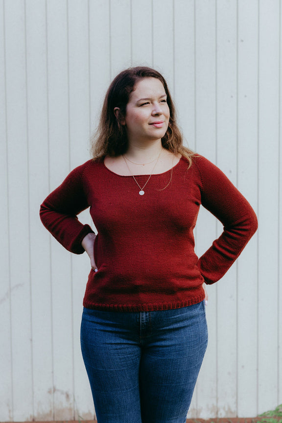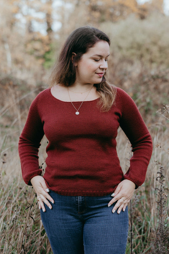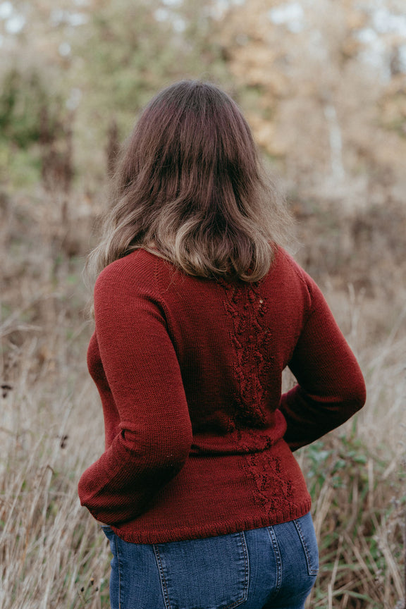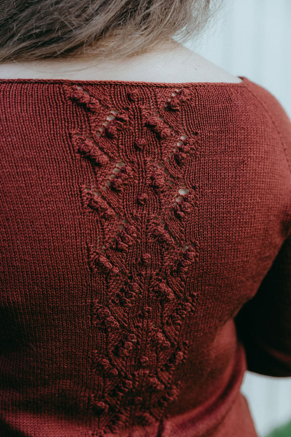 Le pull Calisson est un pull en fingering parfait pour la mi-saison. Il est construit du haut vers le bas (top-down) avec des augmentations raglan, et possède une jolie bande de dentelle romantique et féminine dans le dos. Les manches sont blousantes mais une alternative ajustée est également proposée. Enfin, l’encolure est bordée d’un icord pour une finition délicate.