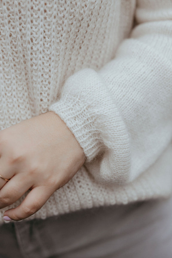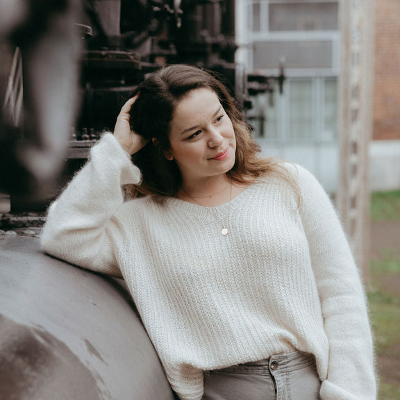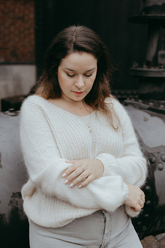 Le pull Cannelé est un intemporel pull à col V tricoté en fingering doublée d’un fil de mohair. Il est construit en top-down, avec des emmanchures raglan. Le corps est entièrement fait de demi-côtes anglaises, qui lui donnent un mœlleux incomparable. Vous pourrez au choix faire de votre pull Cannelé un basique de votre garde-robe, ou l’agrémenter d’une collerette pour lui apporter une touche d’originalité.