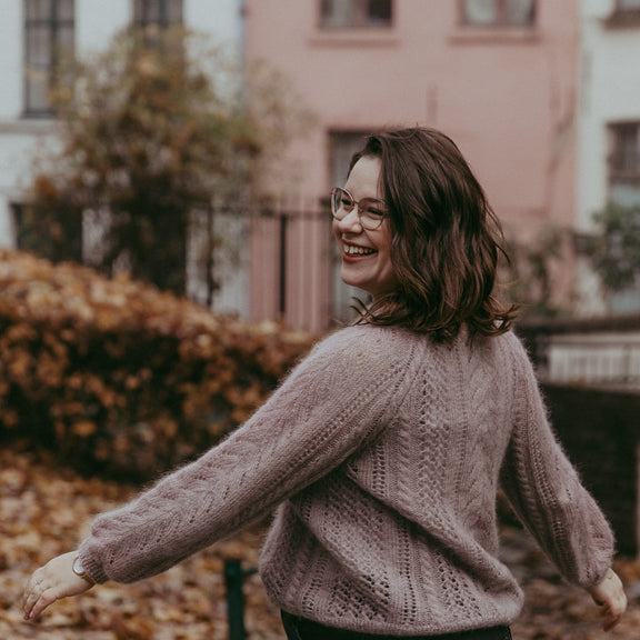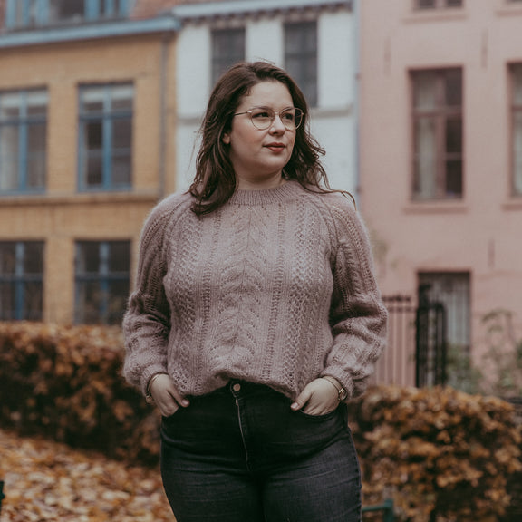 Le pull Gavotte est un pull construit en bottom up, de construction raglan. Il est tricoté entièrement en dentelle et torsades sur le corps, ainsi que sur les manches.