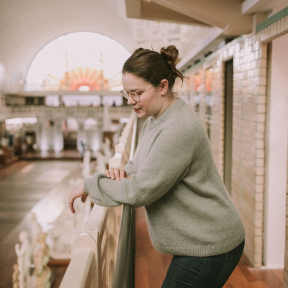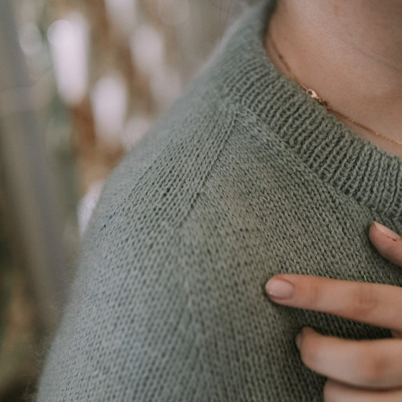 Lolilafée mérinos fingering et mohair soie coloris “Sauge”, tenus ensemble
