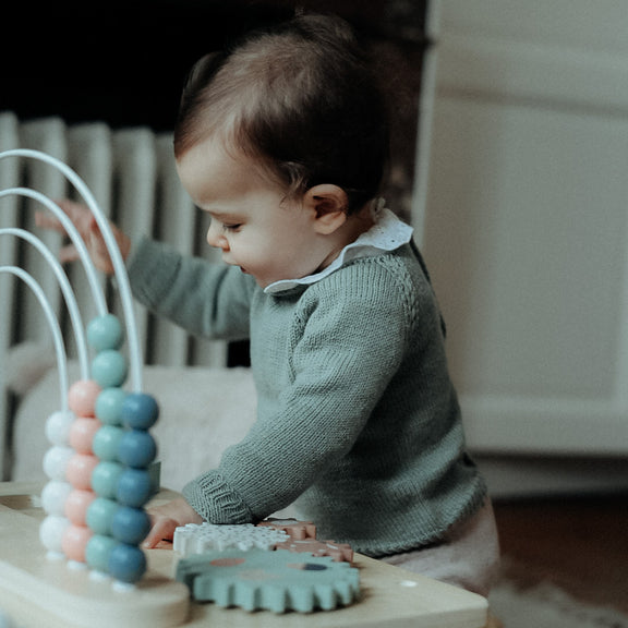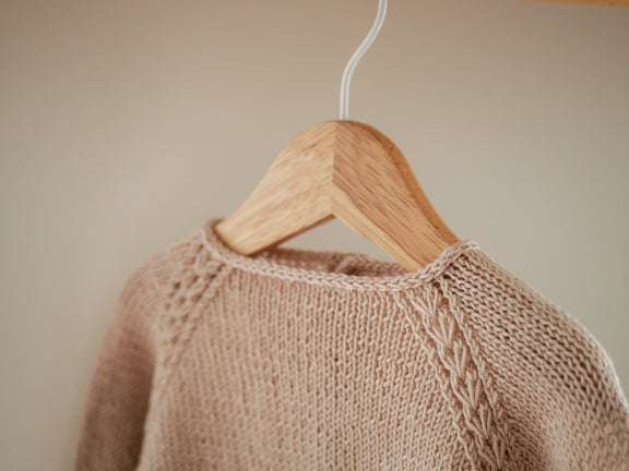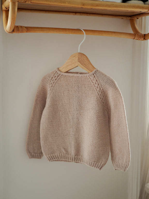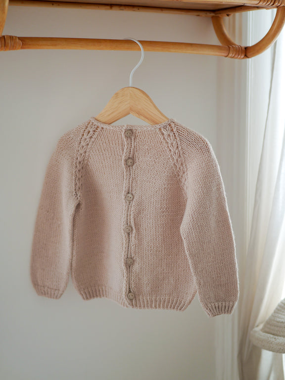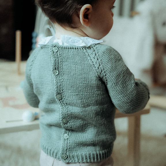 Le pull (mini) Cappuccino est un pull pour enfant, tricoté en bottom-up, de construction “raglan”. Boutonné dans le dos, il est très pratique pour les tout-petits.