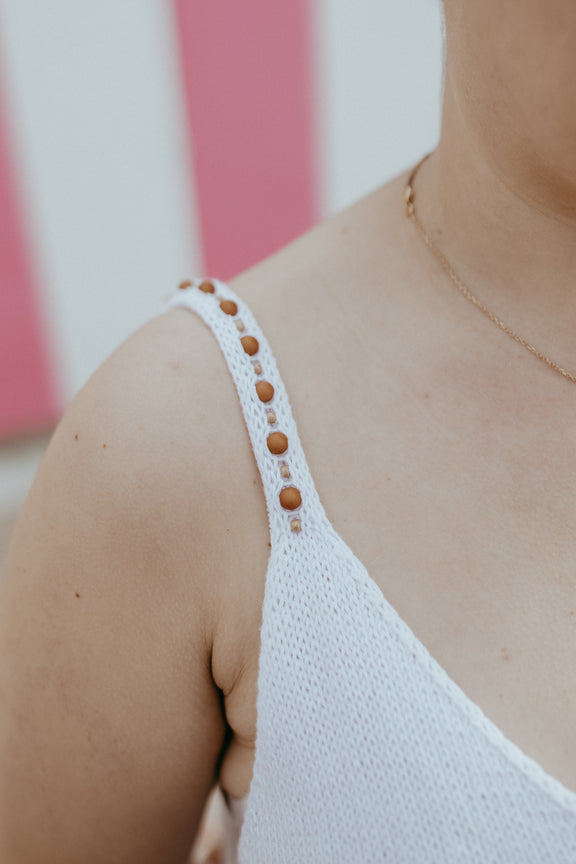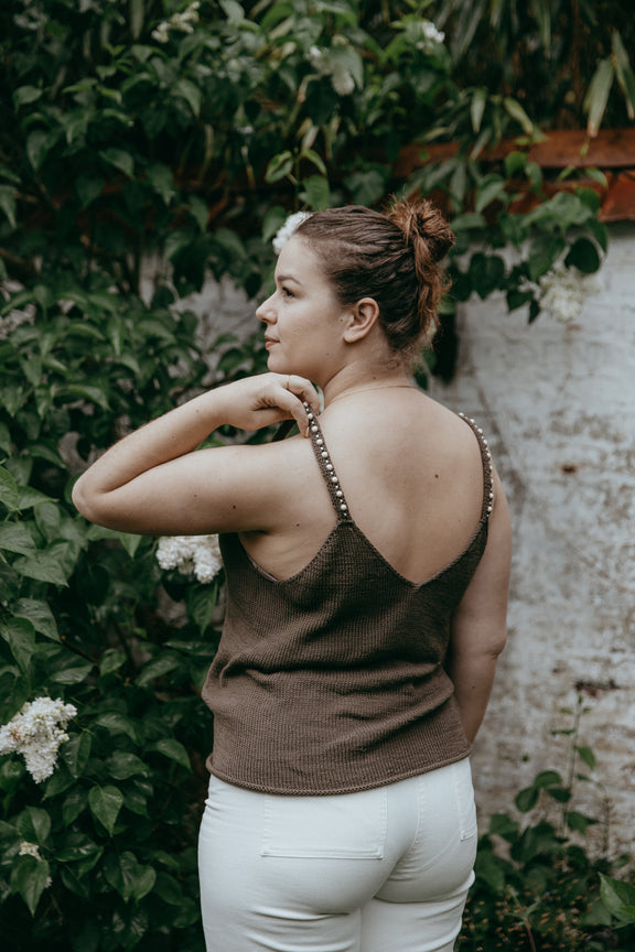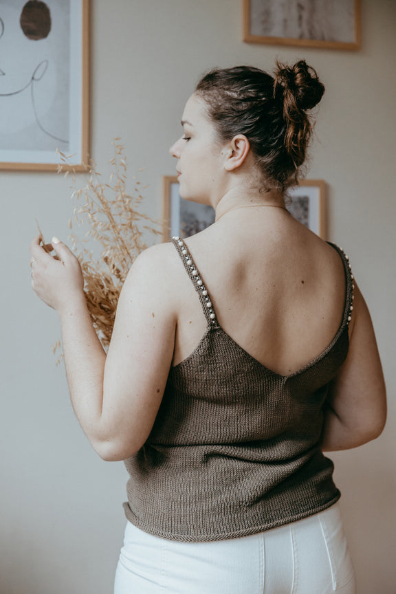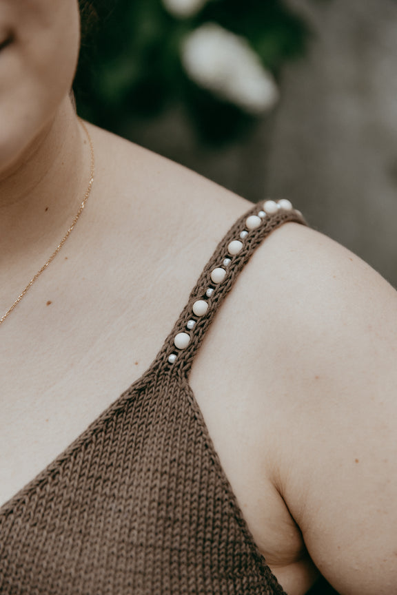 Il est très simple à tricoter mais propose néanmoins de jolies finitions ainsi qu’un look élégant grâce aux bretelles perlées.