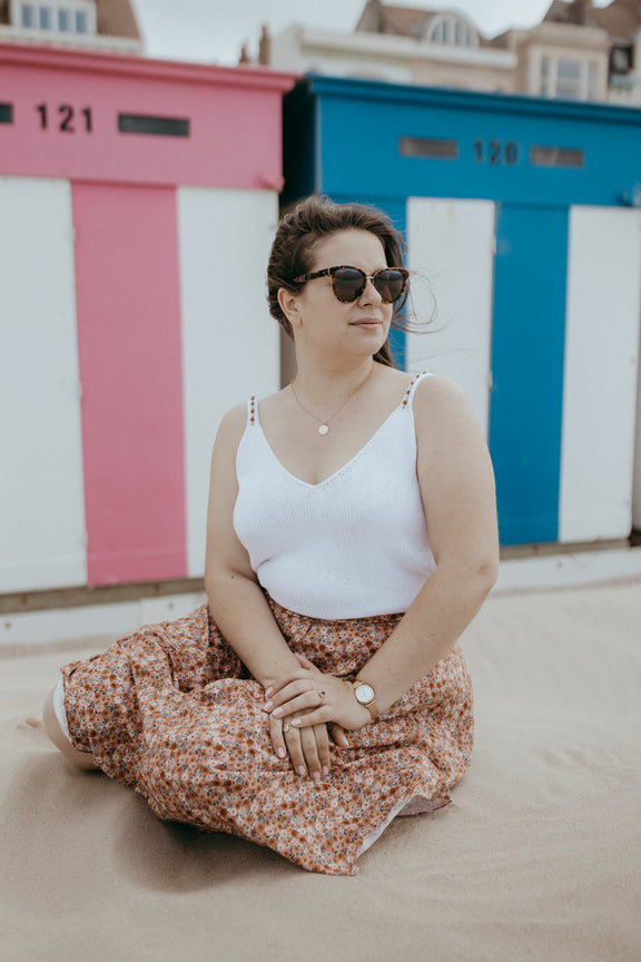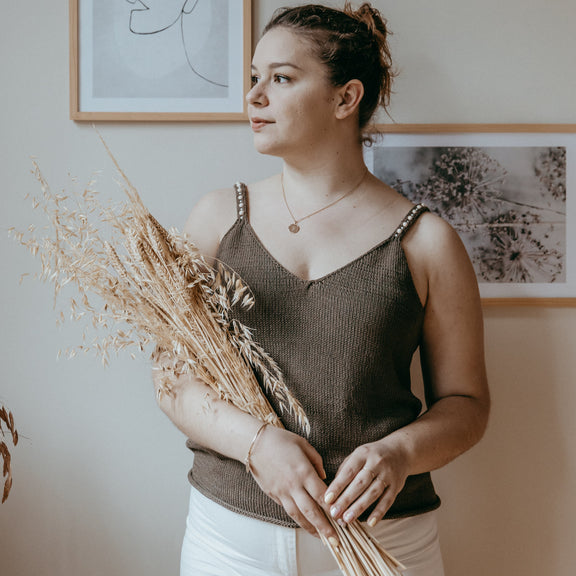 Le top Tropézienne est un haut estival tricoté en coton, tricoté de bas en haut.
